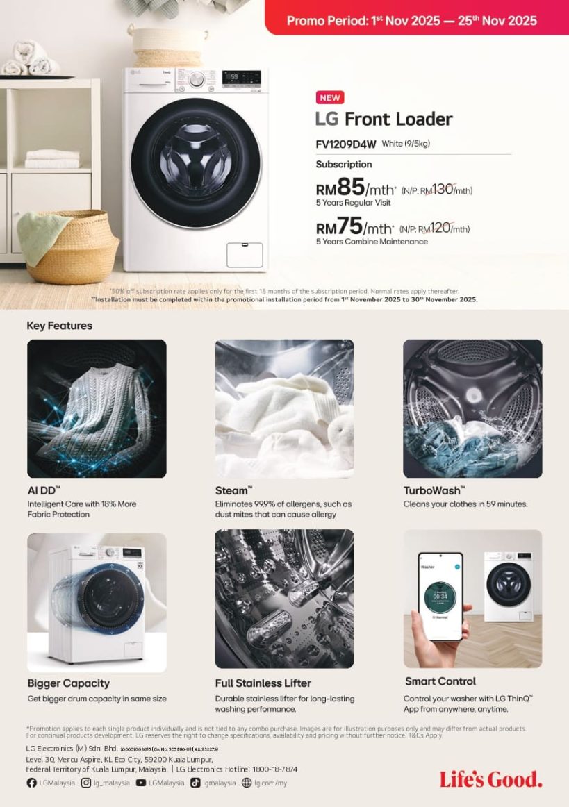 Don't worry about paying thousands of Ringgits to own an electricals. Save money for emergencies. Choose smartly, choose LG™. Why pay more where you can own a piece of LG electrical from RM35 a month? Get your LG home appliances today!
